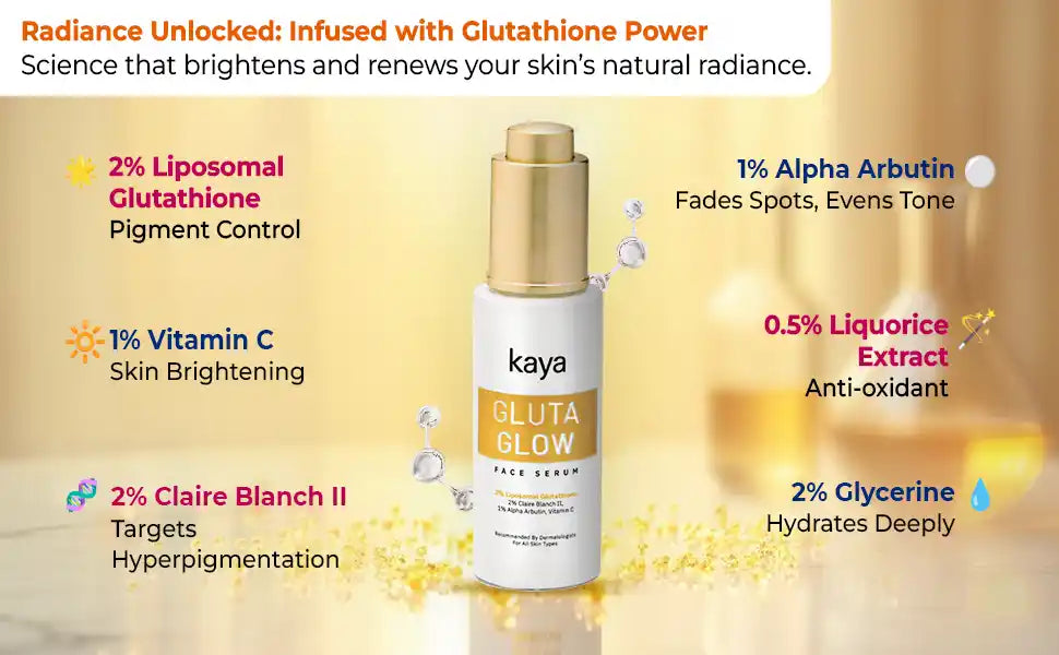 Brightens Skin Tone: Glutathione helps lighten pigmentation and promotes a radiant glow.